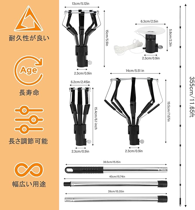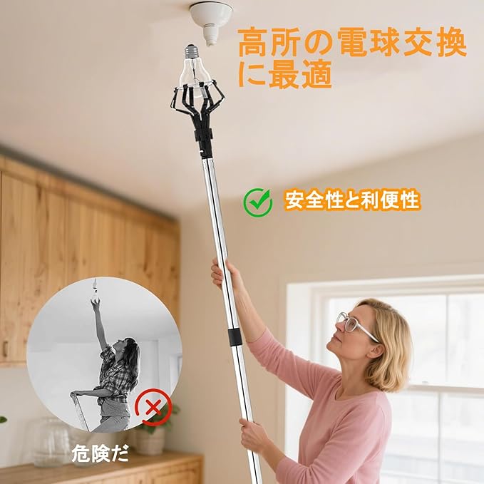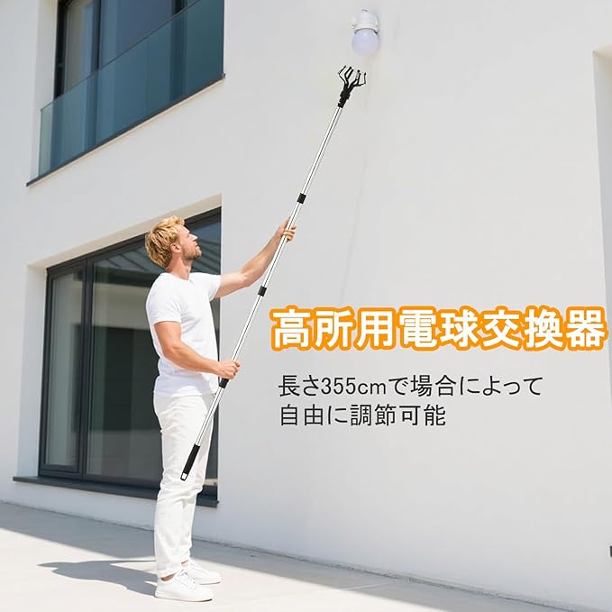 【調節可能な電球交換器具】10節の伸縮ロッドで構成される高所用ランプチェンジャーは、最大長約3.5mまで伸ばすことができます。高品質のステンレス製でたわみにくく、高所の照明や埋込灯、投光器など、手が届きにくい電球の交換を安全にサポートします。※ロッドを組み立てる際は必ずしっかりと締め付け、緩み防止にご注意ください。