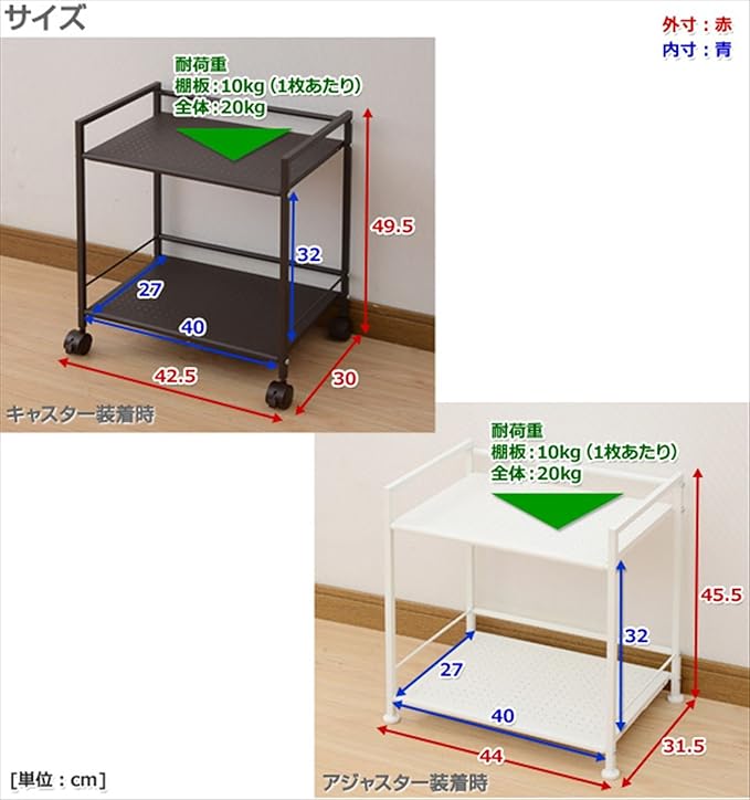 全体耐荷重20kgを超えないでください。各棚板の耐荷重は10kgまでです。組立時は説明書に従い、すべての部品をしっかりと固定してください。移動時はキャスターのストッパーを解除し、使用時は必ずストッパーをかけてください。