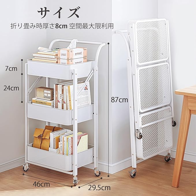 キッチンワゴン 組立不要 3段 折り畳み式 スチールラック 幅46 奥行29.5 高さ87cm バスケットトローリー バスケットラック ハンドル キッチンラック キャスター付き 3段 棚 隙間収納 収納ワゴン 収納カート 収納ラック 移動式