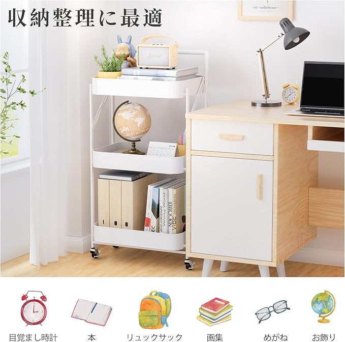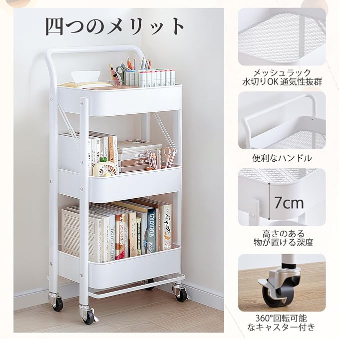 【使用便利】ハンドルとスチールキャスターで移動は非常に便利です。360 自由回転キャスターは4脚中2脚はストッパーが付いているので、使用中に不意の動きを抑制します。 お手入れも簡単です。普通の容器に溜まりやすいホコリは長時間が経てば清潔を保つことは非常に難しいです。下側には小さな穴が開いているメッシュラックが設計しました、通気性抜群で、ホコリも溜まりにくいです。湿気が多い場所・季節にも適しており、お手入れも簡単です。