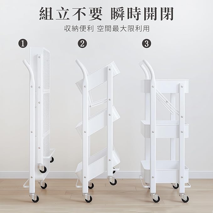 【折り畳み式ラック】折りたたみキッチンワゴンは普通の収納ワゴンとは異なり、面倒な組み立ては必要がありません。手間がかからず、キャスターとハンドルを簡単に付ければ、すぐに使用できます。使わないときにも、折りたたんで部屋の狭いスペースに収納することができます。生活空間を占用せず、空間利用率を最大限にする、非常に便利なスチールラックです。