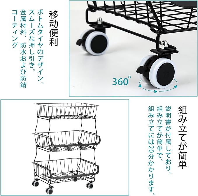 ONEDONE キッチンワゴン キャスター付き ワゴン キャスター付き キッチン収納 カート ラック バスケット 大容量 各段耐荷重10キロ 多機能ランドリー収納 調味料/皿/野菜/服/雑貨収納収納 洗濯室 バルコニー 組立簡単 メタル製 黒