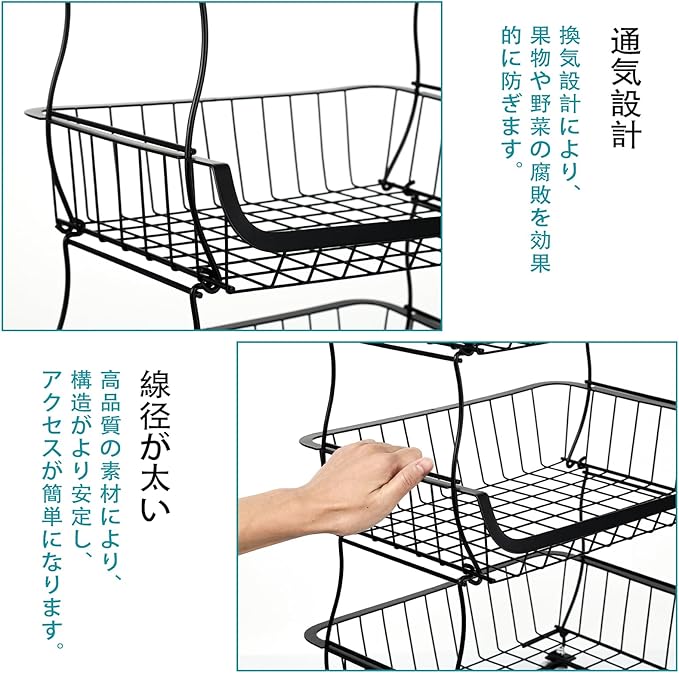 【通気性が優れた】隙間が多く、通気性に優れた、アミ状フレームのバスケットラックで、湿気がこもりにくく、玉ねぎや芋類などの野菜を鮮度を守りながら保管して頂けます。