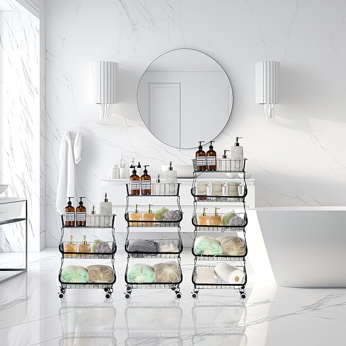 【自由に組み立て、幅広く使える】本製品はスタッキング式なので、お好みで1段から5段まで自由に組み立てられます。またはバスケットを一個一個を分けて収納ボックスとして、食器、調味料、食材、台所の小物などの収納にも適用します。使い方はアイディア次第です。
