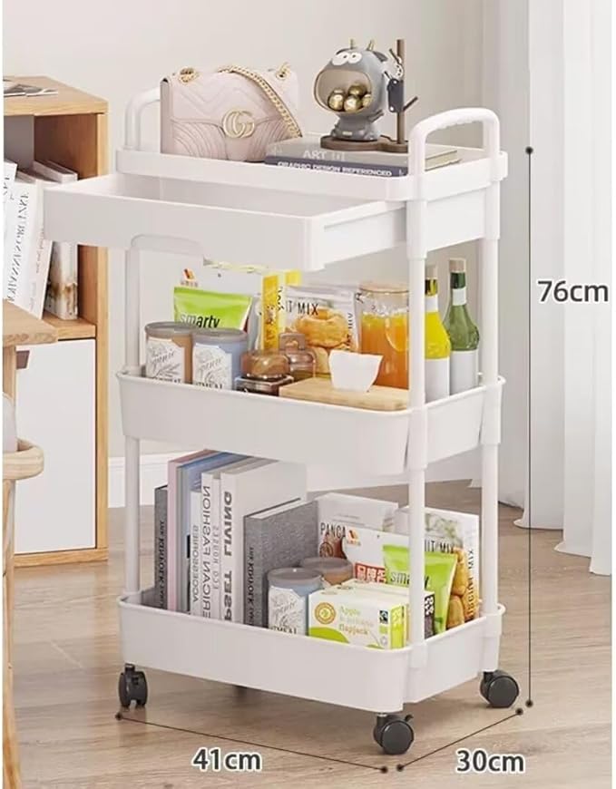 【大容量収纳&引き出し付き】3段キッチンワゴンは段の間隔は約29cm、大容量収納スペースは簡単に様々なペットボトル、调味料、高さのあるカトラリーなどを収納することができます。また、最上段には引き出しがついているので、オフィス書類、文房具、宝飾品などの小物の収納に適しています。