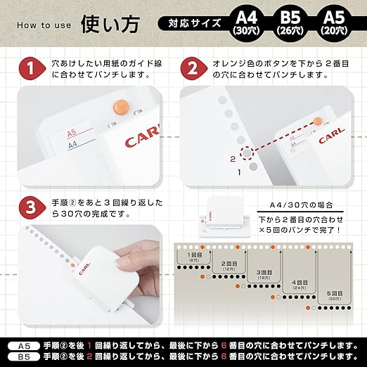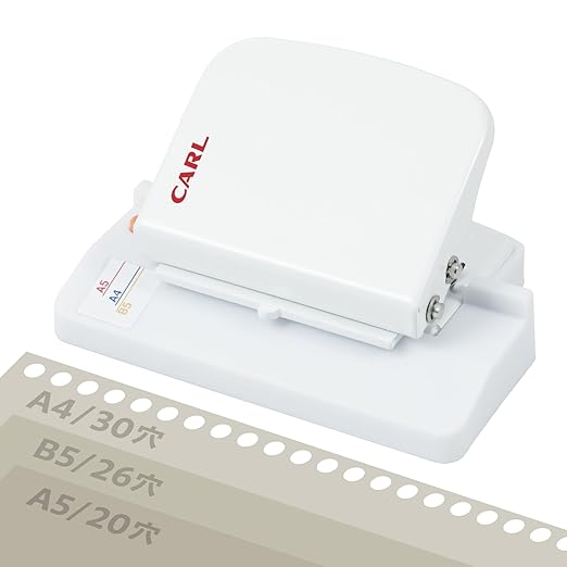 【対応サイズ】A4/30穴,B5/26穴,A5/20穴【穿孔枚数】5枚【穴径】5.5mm 【穴間隔】9.5mm