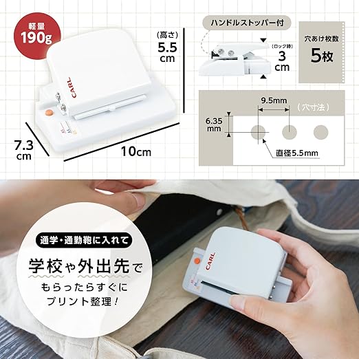 カール事務器 ゲージパンチ・ライト ルーズリーフパンチ 6穴 A4/B5/A5対応 ホワイト コンパクト 軽量 小型 持ち運び便利 携帯用 日本HOT 品質 プリント 資料 学習用 事務用 オフィス用 手帳 バインダー GP-LA-W