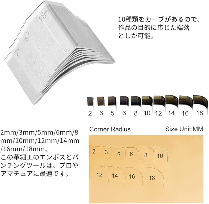 【コーナー半径】10種類をカーブがあるので、作品の目的に応じた端落としが可能。2mm/3mm/5mm/6mm/8mm/10mm/12mm/14mm/16mm/18mm、この革細工のエンボスとパンチングツールは、プロやアマチュアに最適です。