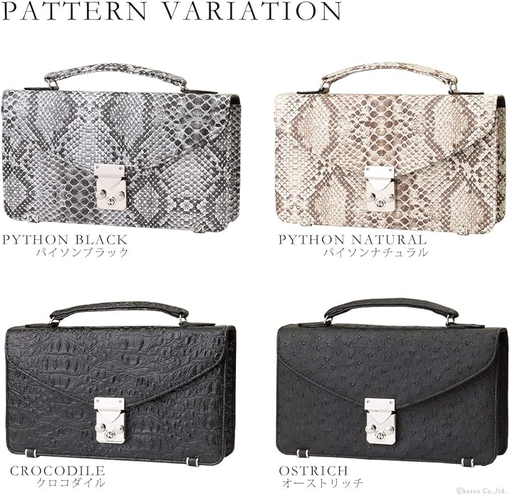 デザインはパイソン(ブラック)、パイソン(ナチュラル)、クロコダイル、オーストリッチの4種類をご用意。