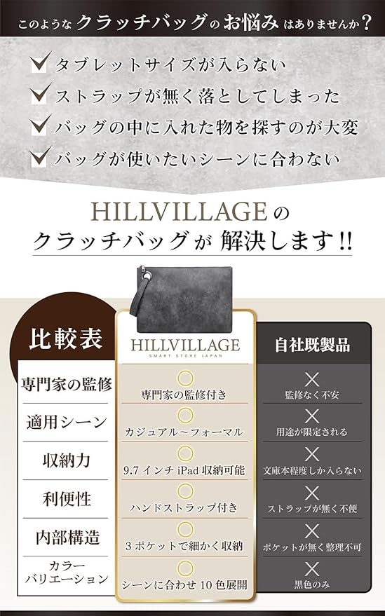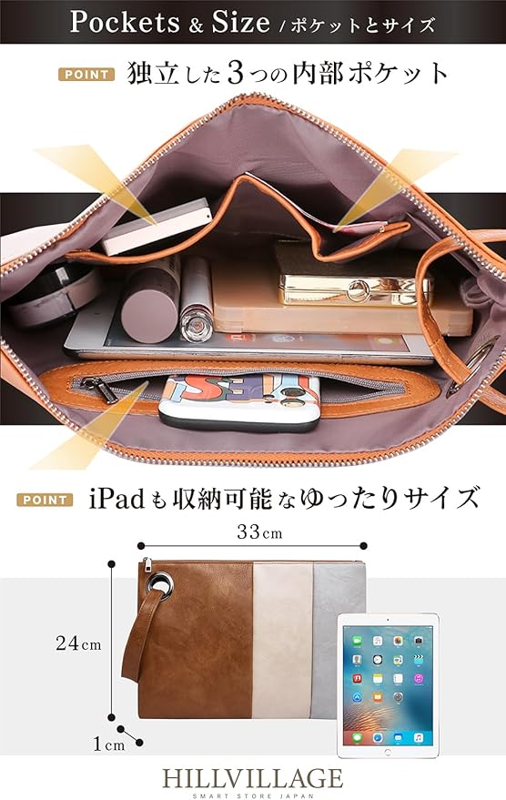 【iPad収納可能なスマート収納】このクラッチバッグは、9.7インチのiPadを収納できる広々としたメインポケットを備えています。さらに、ファスナーポケットとオープンポケットがあり、スマートフォン、財布、鍵などの必要なものをすっきりと整理することができます。機能的でありながらスタイリッシュなデザインが、どんな場面でも役立ちます。