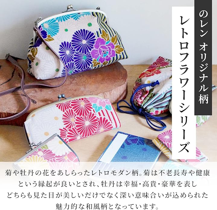 のレンオリジナルのレトロフラワー 柄で作った、小ぶりタイプの2WAYがま口バッグです。マチ広なのにスマートで、ショルダーバッグとしてもハンドバッグとしても、使える持ち手がセットになっているので、2通りの使い方ができます。洋服に合わせてもしっくりくる和柄デザイン。