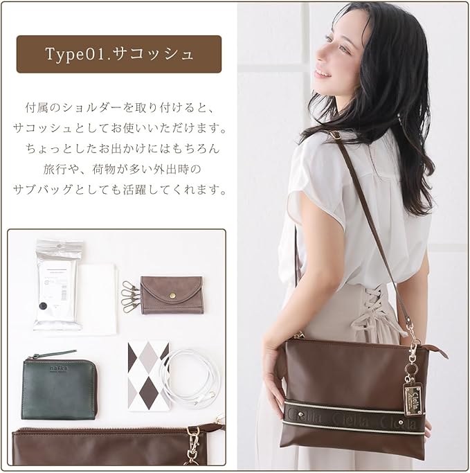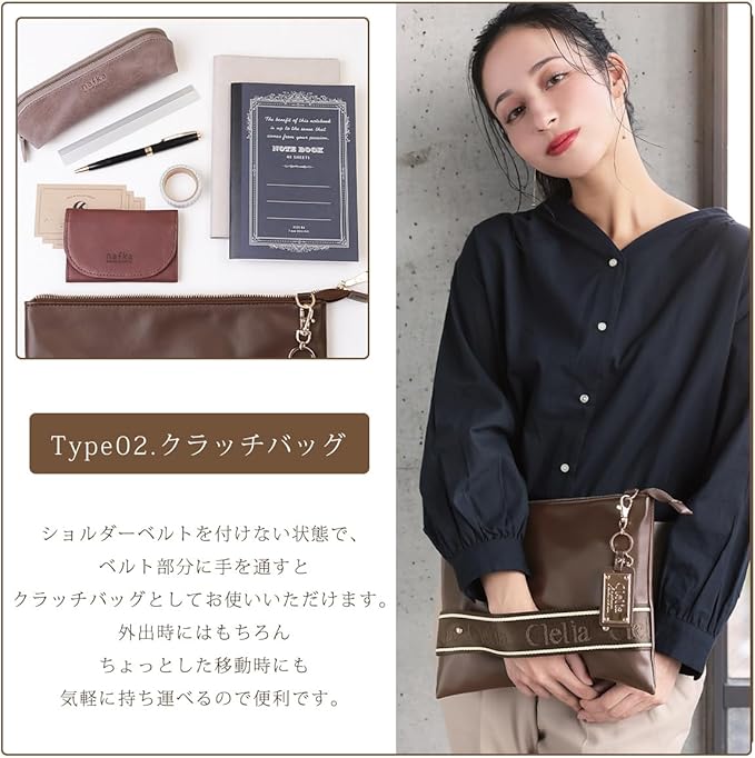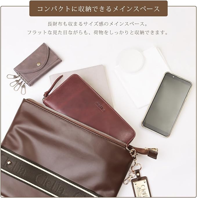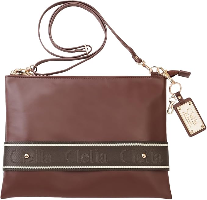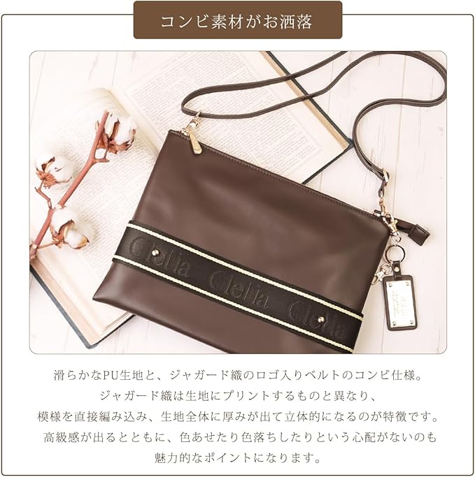 【デザイン性と実用性をMIX】Cleliaは「可愛くて機能的で、それでいてトキメク物じゃないと嫌。」そんな女性のわがままを叶えるために立ち上げられました。ジャガード織りでロゴを表現したベルト使用してデザイン性をアップ。メイン素材にはレザー調で高級感溢れるフェイクレザーを使用。薄マチサイズですが長財布もしっかり収納できるサイズ感のメインスペース。ショルダーバッグとしてはもちろんクラッチバッグとしても持てる2way仕様。A4サイズ対応のバッグに収納可能なのでバッグインバッグとしてもお使いいただけます。