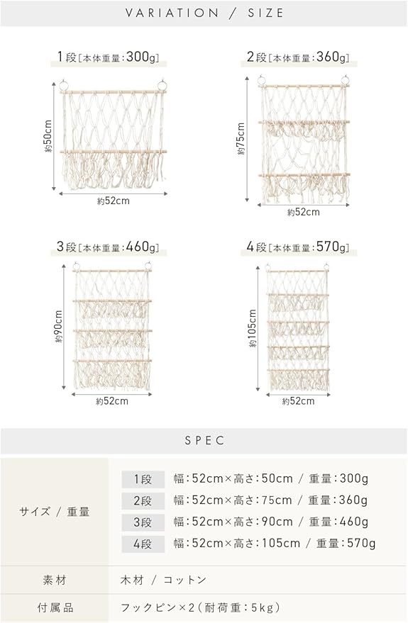 【段数 サイズ】お部屋のスペースや収納量に応じて、1段〜4段から選べる豊富なラインナップ。1段:52cm 50cm(約300g)/ 2段:52cm 75cm(約360g)/ 3段:52cm 90cm(約460g)/ 4段:52cm 105cm(約570g)素材:木材・コットン。