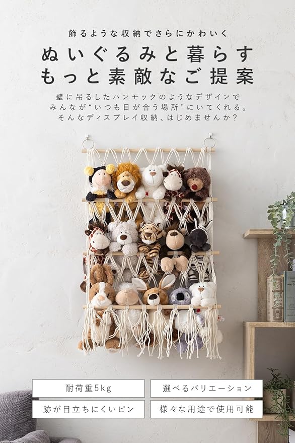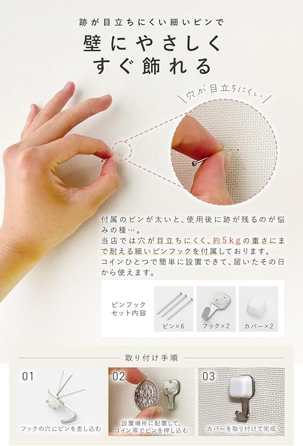 【穴が目立ちにくいピンフック付き】壁に大きな穴を開けずに設置できるピンフック付き。耐荷重5kgで石膏ボードやプリント合板などにも対応。賃貸住宅でも安心して使えます。ぬいぐるみやアパレル小物、雑誌などをしっかり収納。クロス貼りの壁にも対応し、届いたその日から取り付け可能な設置キット付き。