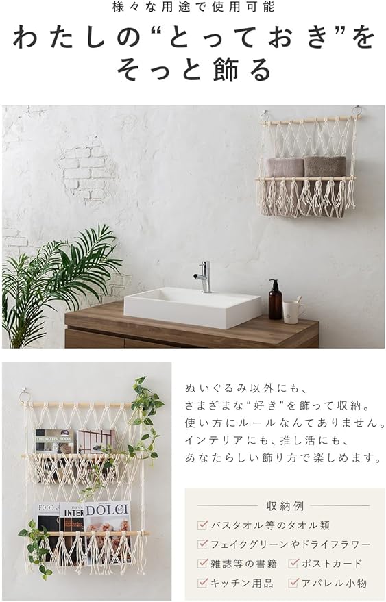 【様々な用途で使用可能】北欧風でナチュラルなネット素材は、どんなお部屋にも優しい雰囲気を添えるインテリア収納に。フェイクグリーンと組み合わせれば癒しの空間に早変わり。見せる収納としても使えて、男女問わず喜ばれるデザイン。誕生日プレゼントや新生活ギフトにもおすすめです。