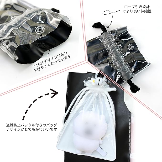【ユニークな外観】巾着ならではの紐締めデザインで、中身のぬいぐるみやフィギュアをしっかりと固定しながらも、サッと取り出せる便利さが特徴です。他のスタイルと比べて、このスタイルはよりキュートでユニークです