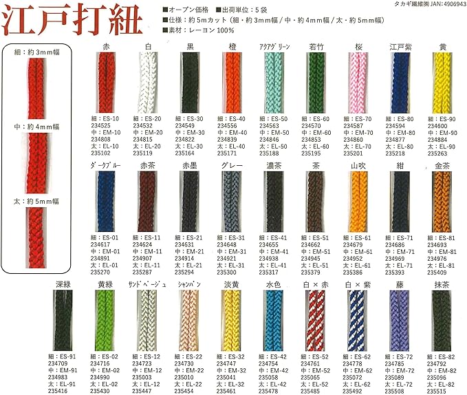 タカギ繊維 Panami 江戸打紐 細 約3mm幅 約5mカット 白 赤 ES- 52 レーヨン100%