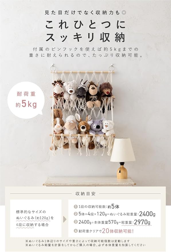 【穴が目立ちにくいピンフック付き】壁に大きな穴を開けずに設置できるピンフック付き。耐荷重5kgで石膏ボードやプリント合板などにも対応。賃貸住宅でも安心して使えます。ぬいぐるみやアパレル小物、雑誌などをしっかり収納。クロス貼りの壁にも対応し、届いたその日から取り付け可能な設置キット付き。
