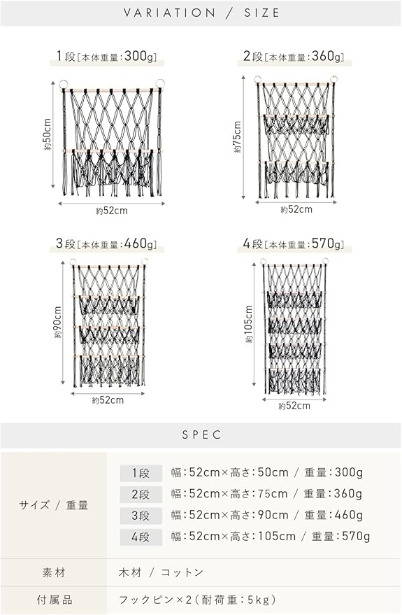 【段数 サイズ】お部屋のスペースや収納量に応じて、1段〜4段から選べる豊富なラインナップ。1段:52cm 50cm(約300g)/ 2段:52cm 75cm(約360g)/ 3段:52cm 90cm(約460g)/ 4段:52cm 105cm(約570g)素材:木材・コットン。