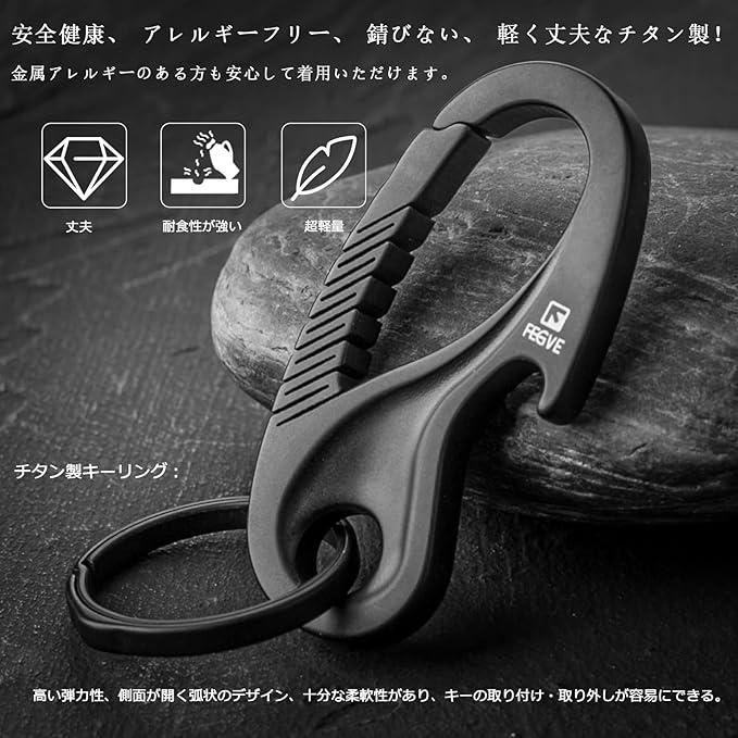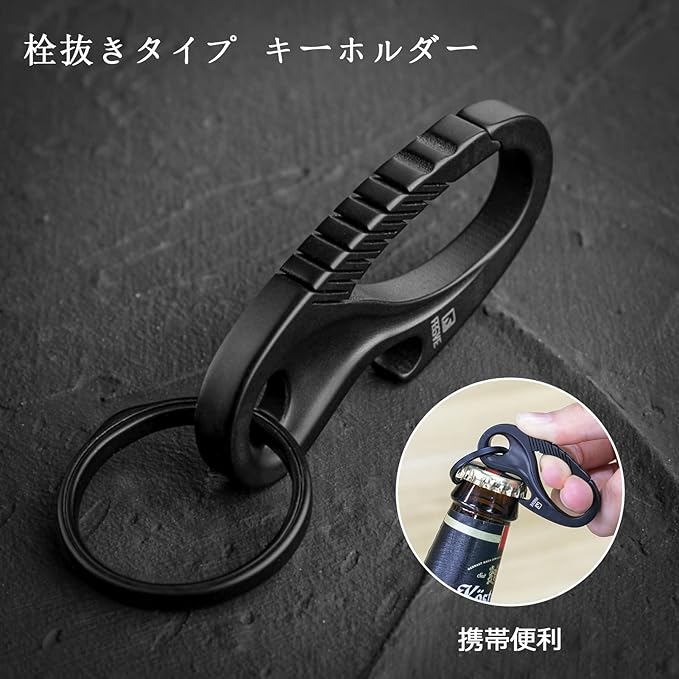 TISUR チタン カラビナ 栓抜き キーホルダー メンズ おしゃれ キーリング 車 バイク スマートキー用に 防錆 紛失防止 取付簡単(ブラック/カラビナ+チタン リング)