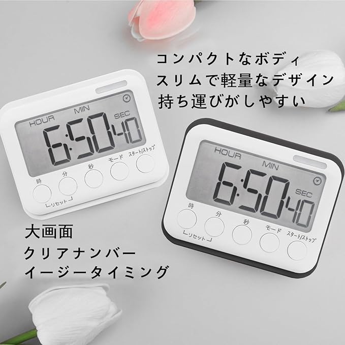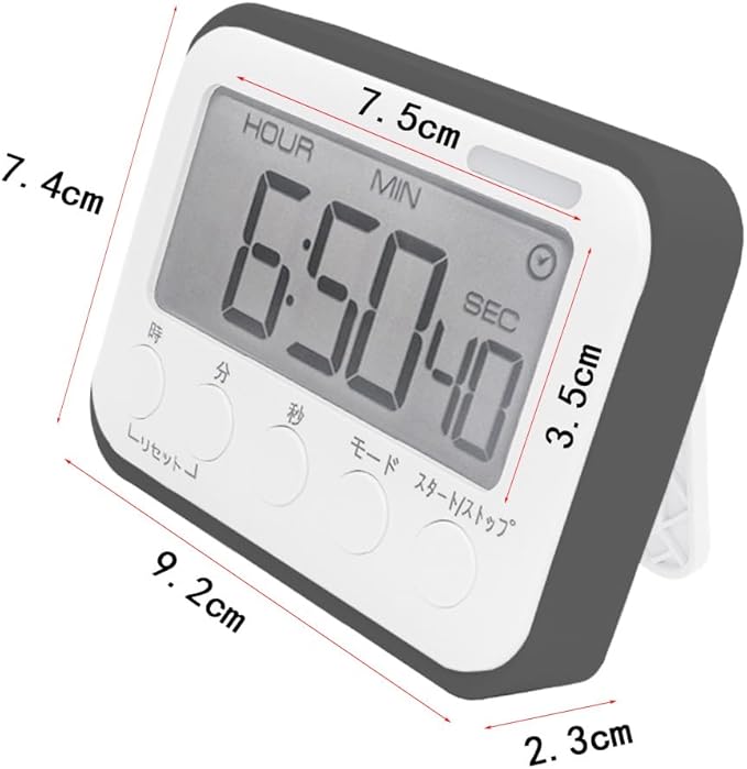 ☆【充実した機能】①音光切替可・消音モード付き、タイマーは背面に音とフラッシュの切り替えスイッチがあり、音が必要なときは70db以上の大きなアラームを鳴らし、音が必要ないときはフラッシュモードに切り替えることができるので、図書館や深夜など、周囲に迷惑をかけないようにすることができます。②大画面、これまでにない太い字体で、遠くからても画面から正確にはっきり数字を見えますので、お年寄りや子供にも使いやすいです。③5つのボタンがあり、トグルボタンを押すたびに時計、アラーム、クロノグラフの各モードが自在に切り替わります。