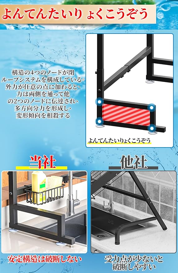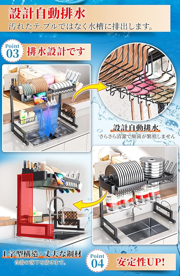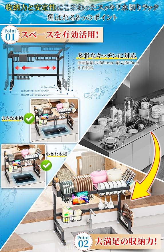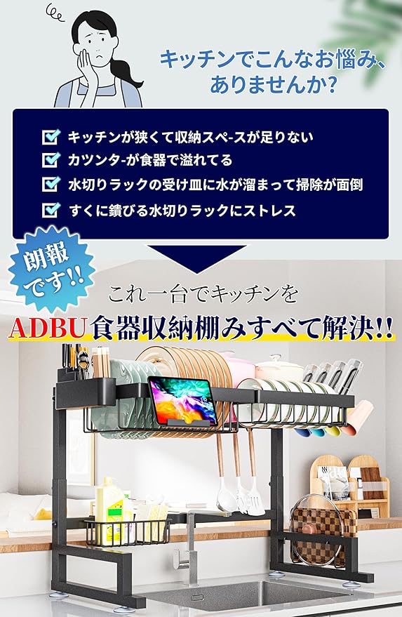 ADBIU 【24.5インチ~32インチのシンクにフィット】 2025年版 シンク上水切りラック (拡張可能な寸法) スナップオンデザイン 2段 大型キッチンディッシュラック ステンレススチール カウンターの整理と収納