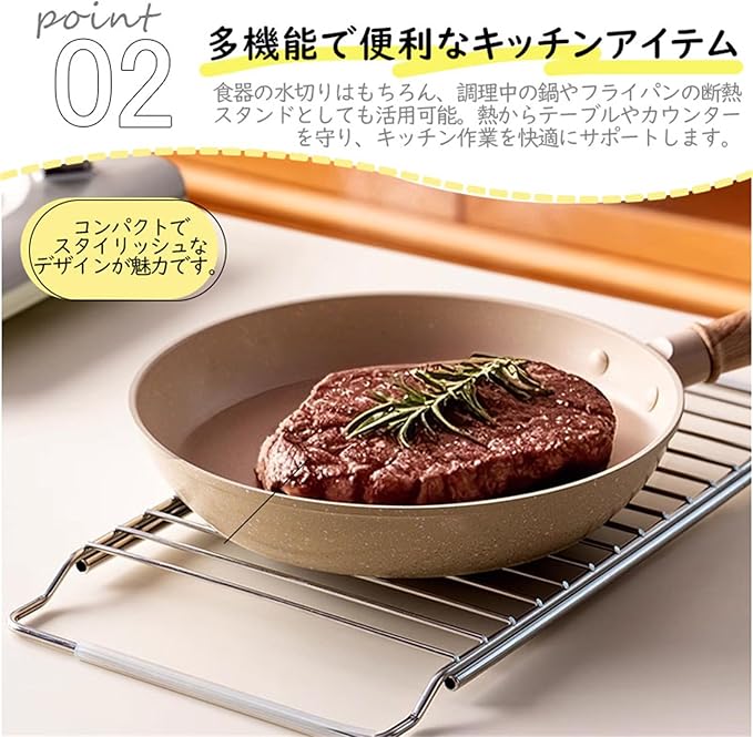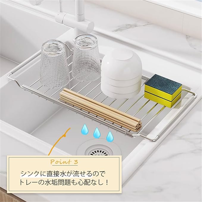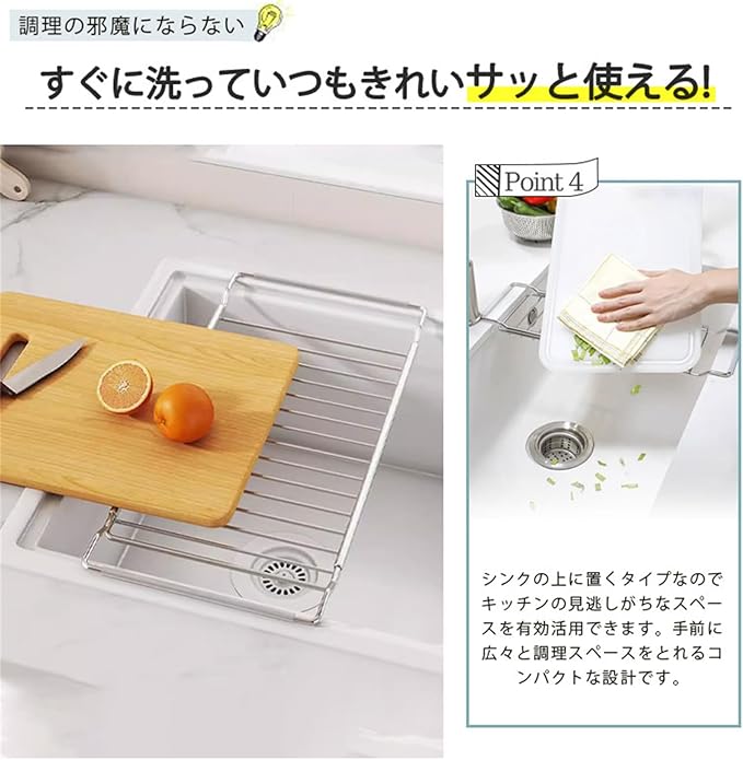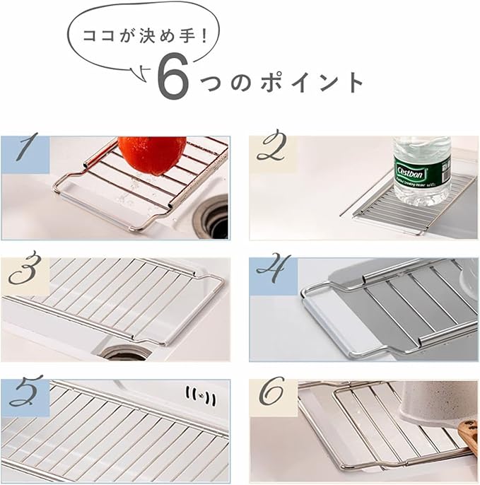 滑り止め付きで安定感アップ:シンクにしっかりフィットする滑り止め付きでキッチンの傷つきを防ぎます。食器をのせてもぐらつかず、安定した使用感で安心です。