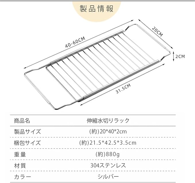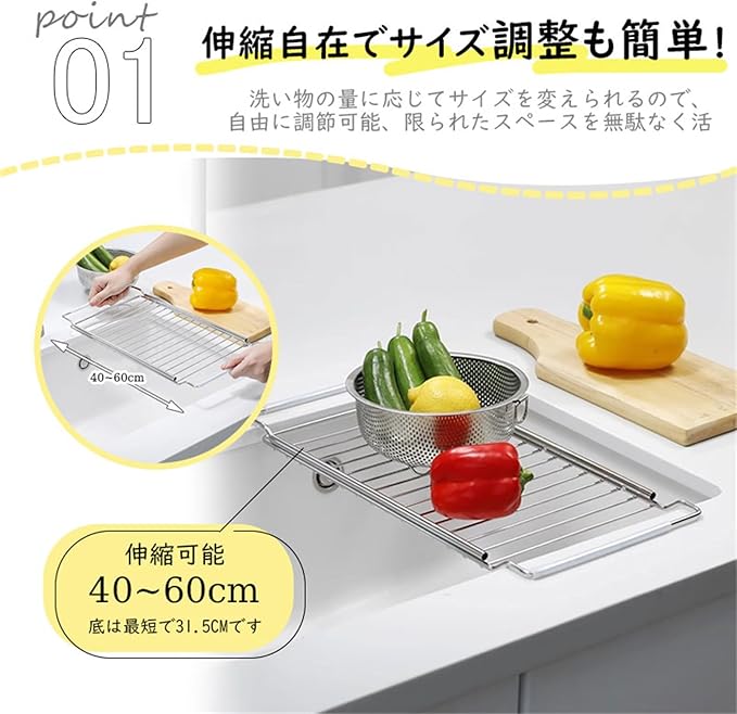 シンクのサイズに合わせて自由に伸縮!伸縮式デザインで、シンクの幅に合わせて調整できます!長さ約41cm~60cmまで自由に伸ばせるから、キッチンのスペースを有効活用できます。