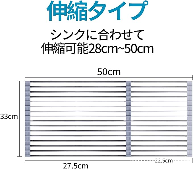 幅調整可能食器 水切り:伸縮自在で、28cm-50cmの幅に対応しています。幅が不適切でシンクの上にしっかりと置けないという心配はなく、それに、両サイドのシリコンがシンクにしっかりとくっつきます。食器だけでなく、洗った野菜や調理中の食材などものせられます。