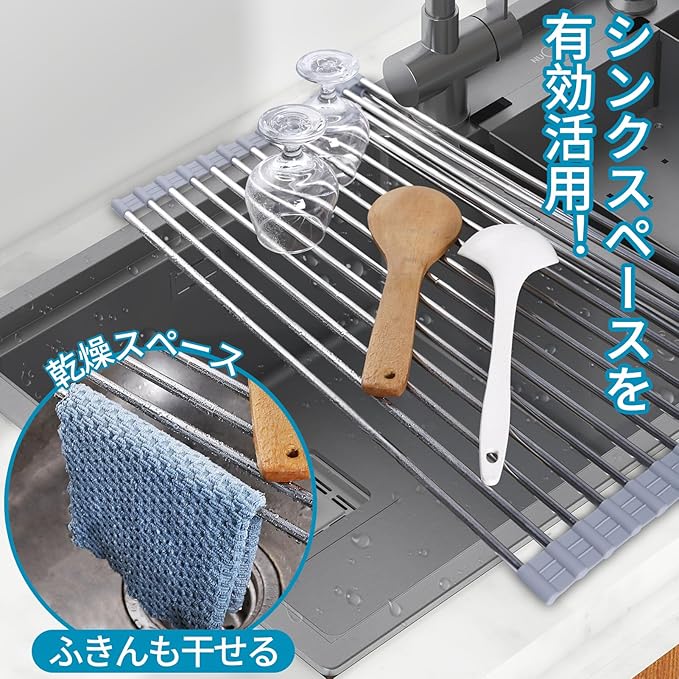 水切りラック 折りたたみ 伸縮タイプ水切り 抗菌 耐熱 錆びない 滑り止め サイズ調整可能 28-50cm 食器水切り 食器乾燥ラック 巻き収納 キッチン用品 (グレー)