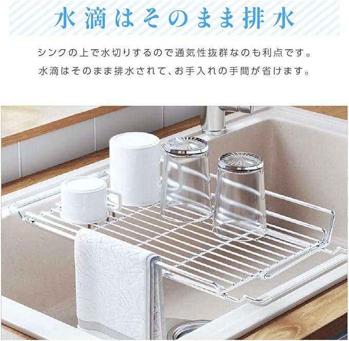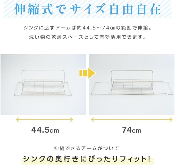 【伸縮式でシンクにぴったりフィット】シンクのサイズに合わせて幅44.5~74㎝まで自由に調整できる伸縮式水切りラック。スペースを最大限に活用でき、キッチンのレイアウトに柔軟に対応。どんなスタイルのキッチンにも馴染み、限られたスペースでも効率よく使えます。