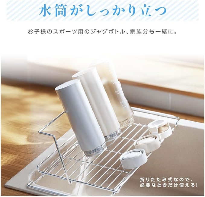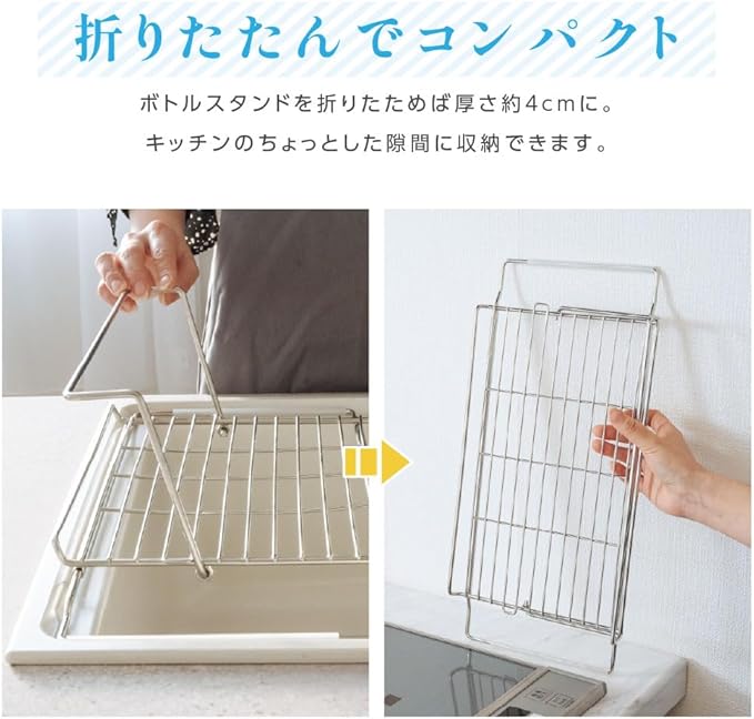 【折り畳み式でコンパクト収納】使用しないときは折り畳み式で厚さ約4cmに。キッチンの隙間にもすっきり収納できる省スペース設計です。洗った食器、調理器具、カップ類をしっかり収納しつつ、ボトルホルダー付きで倒れる心配なし。使い勝手の良さと機能性を兼ね備えた便利なアイテムです。
