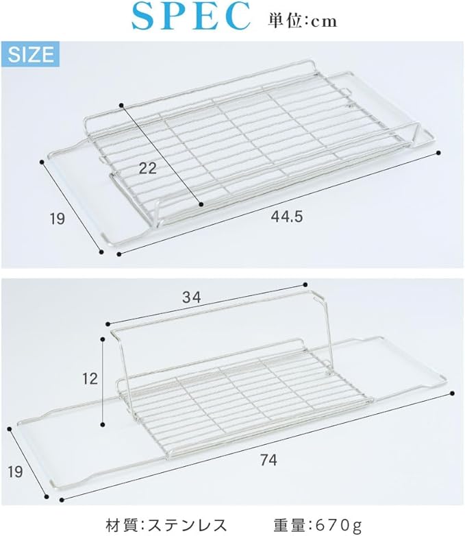 【商品仕様】サイズ(約):幅44.5~74㎝、奥行22㎝(内寸19㎝)、高さ12㎝。重量(約):0.67㎏。本体材質:ステンレス(防水・錆びに強い)。