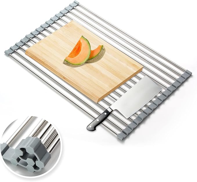 D.E. 【水切りラック シンク上 折りたたみ】44cm*30cm 食器 まな板 ペットボトル 各種物品 水切り用 コンパクト 省スペース スリム キッチン 折畳み【ステンレス鋼 & シリコン&グレー】