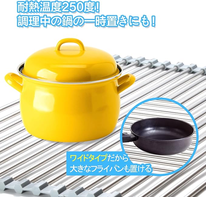 【耐荷重+耐熱+耐久】最大耐荷重20kgで、まな板を切ることができます。 耐熱250度まで耐熱性なので、熱鍋を防ぎます。 丈夫なステンレススチールとシリコンを採用し、非常に丈夫な素材です。