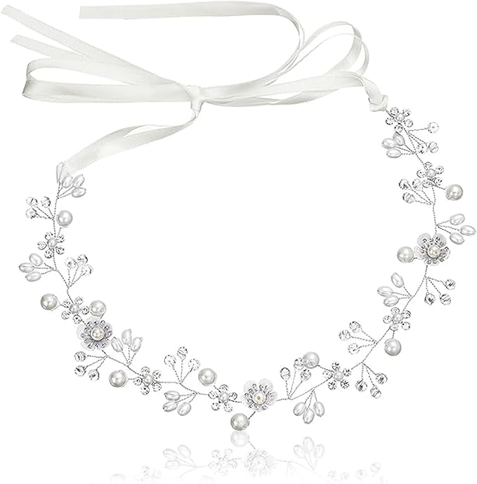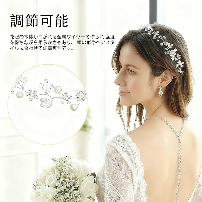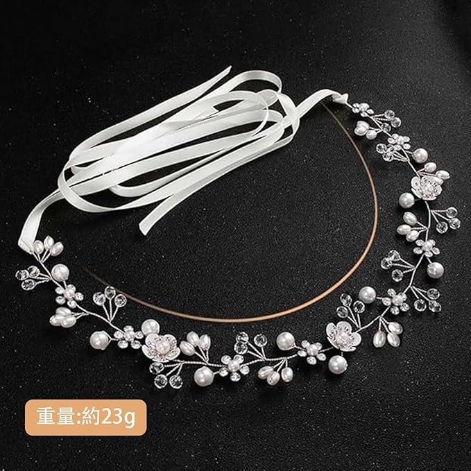 FineGood 髪飾り 花 パール 花かんむり リボン ホワイト ヘッドドレス クリスタルビーズ 花冠 ヘアアクセサリー 結婚式 発表会 披露宴 卒業式 パーティー ダンス 和装 撮影 写真 子供 大人用(シルバー)