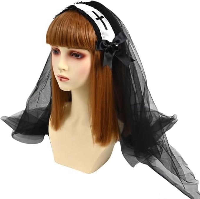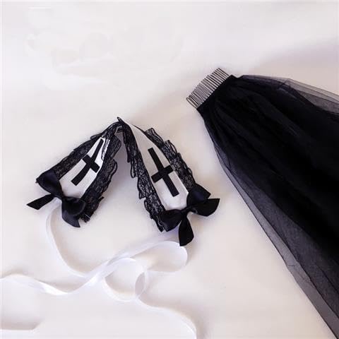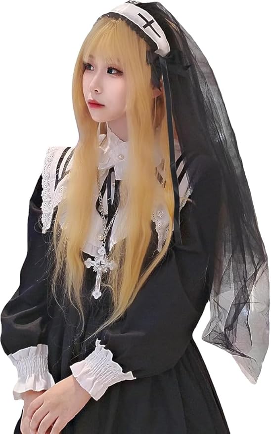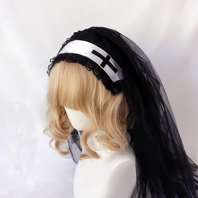 [LONTG] シスター コスプレ ベール ヘッドドレス 十字刺繍 リボン ヘッドバンド付き 修女 修道女 仮装 ヴェール 教会 夜 聖女 宣教師 メイド ロリータ風 ベール 花嫁 姫系 ゴスロリ ショール ハロウィン 髪飾り ヘアアクセサリー
