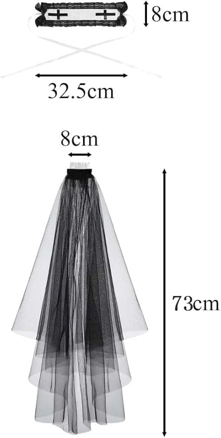 【仕様】ベールサイズ長さ約73cm 、コーム幅8cm、ヘッドバンド長さ32.5cm 、幅8cm、カラー:ブラック(黒いベールと白地に黒十字のヘアバンド)、ホワイト(白いベールと黒地に白十字のヘアバンド)、パッケージ内容:ベール* 1、十字刺繍ヘッドバンド* 1