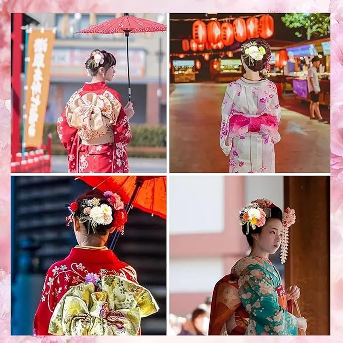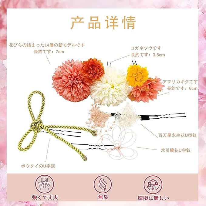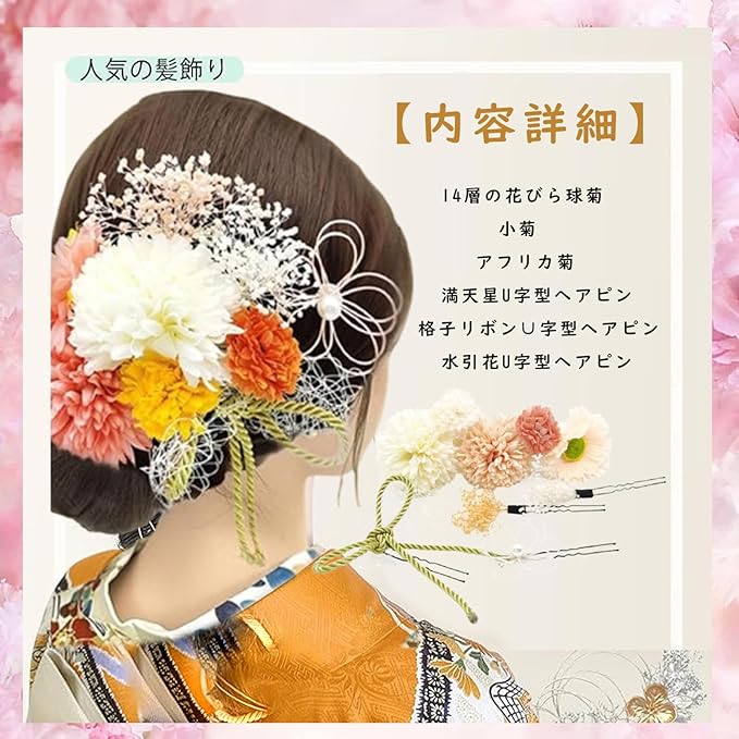 【内容詳細】 14層の花びら玉菊(長さ約7CM)、小菊(長さ約3.5CM)、ガーベラ(長さ約6CM)、カスミソウU字型ヘアピン、グリッドボウ∪字型ヘアピン、水引花U字型ヘアピン
