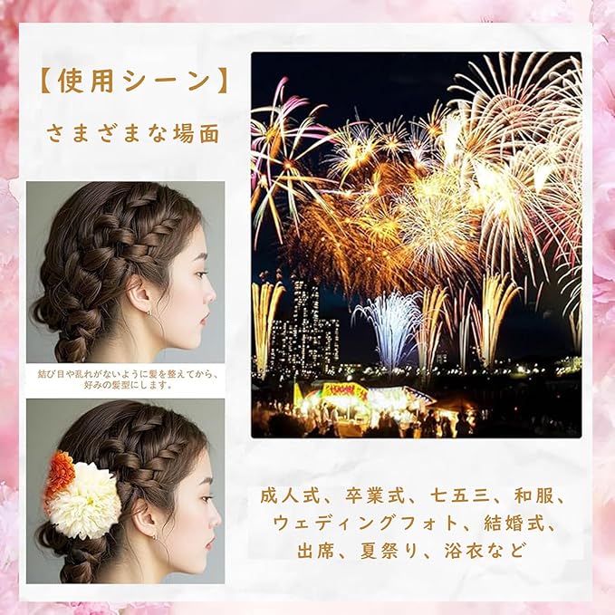 【ご使用シーン】 成人式、卒業式、七兄山、着物やドレス、撮影前、結婚式、イベント出席、夏祭り、花火大会、浴衣(夏着物)など、あらゆる場所で使用できます。
