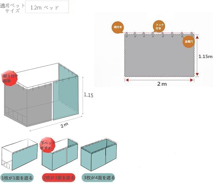 【取り付け簡単】縄とフック付属。カーテンが付いた孔にフックを通して、ロープをベッドの周りに掛けて、フックをロープに吊り下げるだけでいいです。1枚は前だけをブロックでき、2枚は3面にブロックでき、3枚は4面にブロックでき、予めご了承ください。