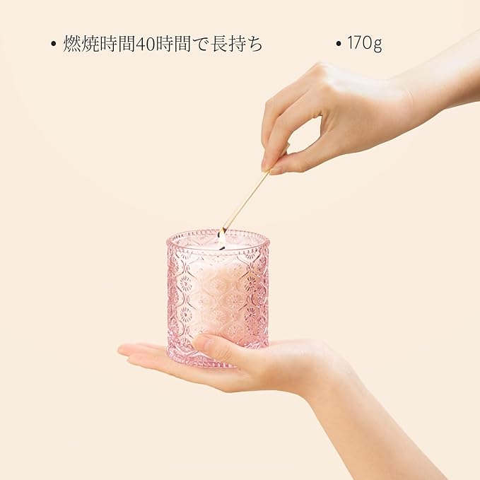 サイズと燃焼時間 ー 170グラム。自然由来ワックスとリードフリーのコットンウィックでクリーンにお楽しみいただけます。燃焼時間40時間。クルエルティーフリー、防腐剤フリー。