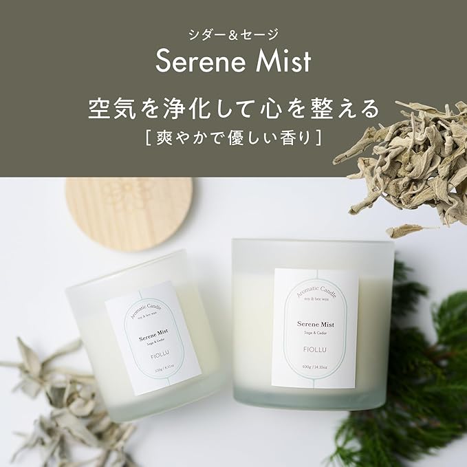 【香り】Serene Mist - 空気を浄化し、心を整える香り。雨上がりの森に漂う澄んだ霧のヴェール。セージのピュアな香りが空間を浄化し、シダーの落ち着きが心を穏やかに整えてくれます。