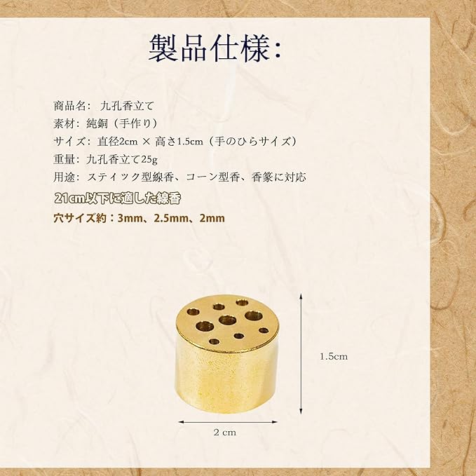 この真鍮製お香立ては、素材から仕上げまでこだわり抜いた上質な一品です。安価な合金やメッキ銅ではなく、100%純真鍮を使用しており、手に取った瞬間に感じられる重厚感と高級感が特徴です。使い込むほどに深みのある色合いへと変化し、真鍮ならではの経年美を楽しむことができます。 コンパクトな円柱型デザイン(直径2cm・高さ2cm)は、どんな空間にも自然に馴染み、和室・洋室を問わず上品な印象を与えます。底面が安定しているため、お香をしっかりと支え、転倒の心配もありません。穴のサイズは2mm、2.5mm、3mmの3種類があり、さまざまな太さの線香に対応可能です。また、貫通式の構造になっているため、燃え残った線香を簡単に取り除くことができ、お手入れもとても簡単です。 ひとつでもお使いいただけますが、複数を組み合わせて香炉皿や香灰と一緒に使用することで、香道のような雰囲気を演出できます。お香を立てて香りを楽しむだけでなく、真鍮工芸品としてインテリアのアクセントにも最適です。ヨガや瞑想、読書、茶の時間など、心を落ち着けたいひとときに寄り添います。 客間、寝室、書斎、仏壇、ヨガスタジオなど、あらゆる空間に穏やかな香りと美しい金色の輝きを添えてくれます。恋人や家族、友人へのプレゼントとしても喜ばれる、シンプルで高級感のある真鍮製線香立てです。