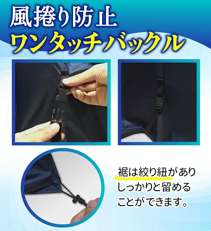 【風でとばない】カバーをとめるベルトがついており、車椅子にそってしっかりとカバーを固定することができます。また裾を絞る紐が付いているので、風がカバーの下からはいり巻き上がってしまうことを防ぐ仕様となっています。
