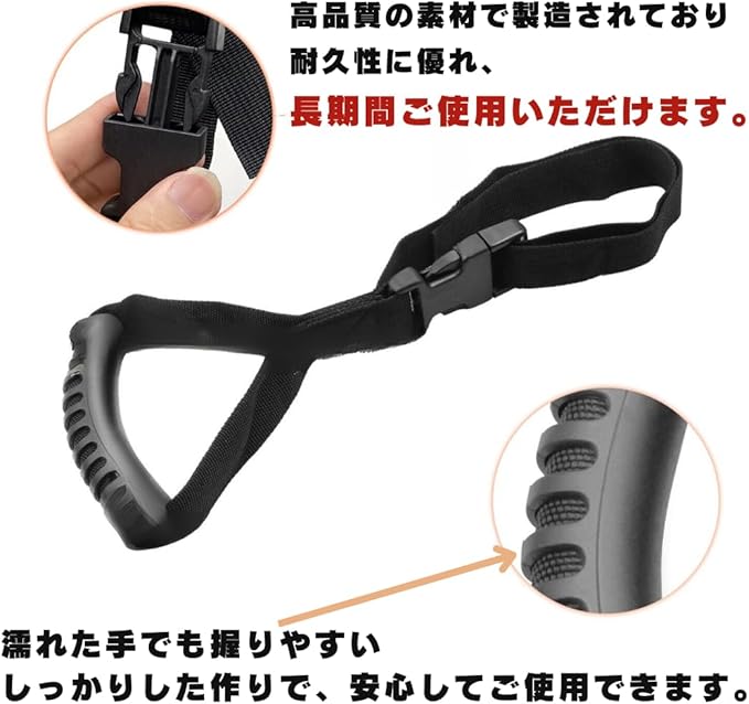 本製品のハンドル部分はコンパクトながらも握りやすい形状で、長さは調整可能です。最短25cmから最長38cmまで伸ばすことができ、使用者の体格や車の構造に合わせて最適な長さに調整可能です。また、ストラップの幅は3cmで、安定感を確保します。