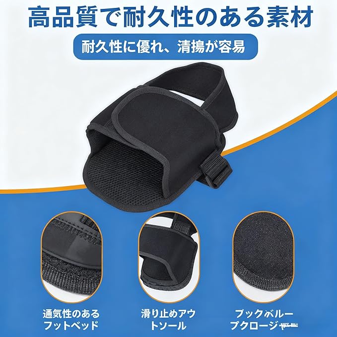 【面ファスナーで簡単装着】フットレストに置き、調整ストラップを面ファスナーで止めるだけ。わずか数秒で取り付けが完了します。