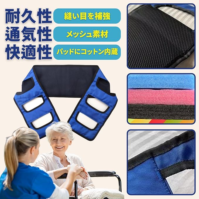 介護ベルトは、高齢者の介護、足上げ、介助やリハビリ、車いす使用者の移乗や起き上がりを補助する介護、介助用品。被介護者の背中などに装着して、介護者がベルトのハンドル部分を握り被介護者の重心を安定させます。
