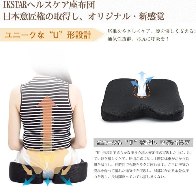 【お尻を包んで支える立体設計】やや凹みで両側は自然にお尻にフィットし、お尻にかかる圧力を分散します。【前端はW字型デザイン】両側はお尻の圧力をよく吸収します。自然にお尻を合わせて優しく包み込んで、フィット感抜群。【後端はU字型デザイン】 ユニークなU型構造で尾てい骨など弱い部位を避け、従来のクッションよりもたらす尾椎のあっぱく感という欠点を改良した。座った姿勢から尾骨にかかる圧力を軽減し、 尾てい骨を優しくケアし、座り心地良いです。また、この独自の設計により、クッションの通気性が良くなり、長時間座っていても蒸れにくくなります。