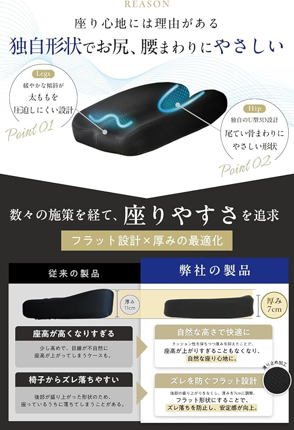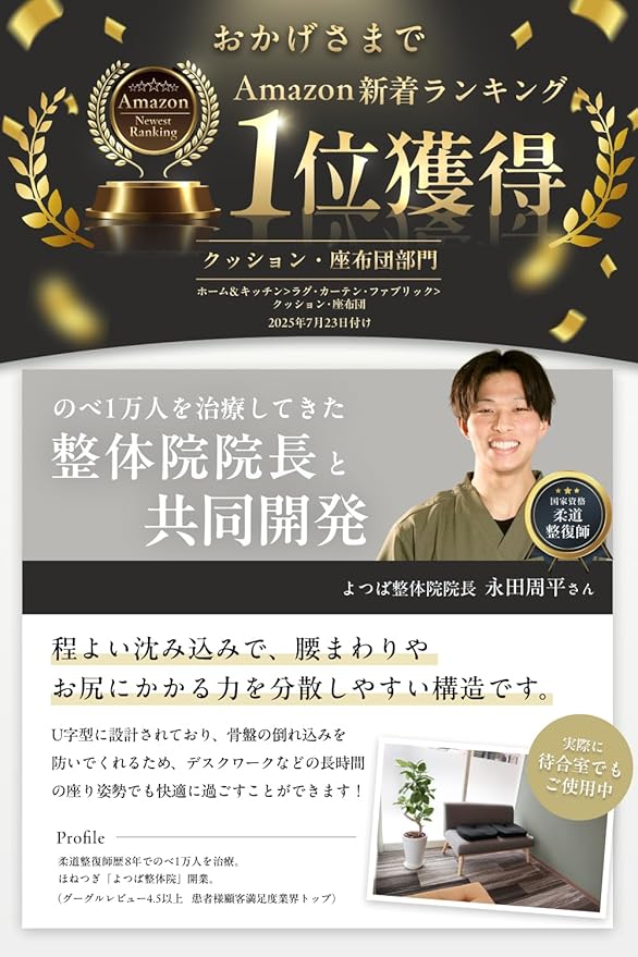 ✅【整体院院長との共同開発】 整体院の院長と共同で設計を行い、座り姿勢を安定させやすい形状に仕上げました。骨盤まわりを自然に支え、長時間座ってもお尻が痛くなりにくい快適な座り心地を追求しています。ゲーミングチェアやオフィスチェアと併用することで、作業中やゲームプレイ時の着座姿勢の保持をサポートします。